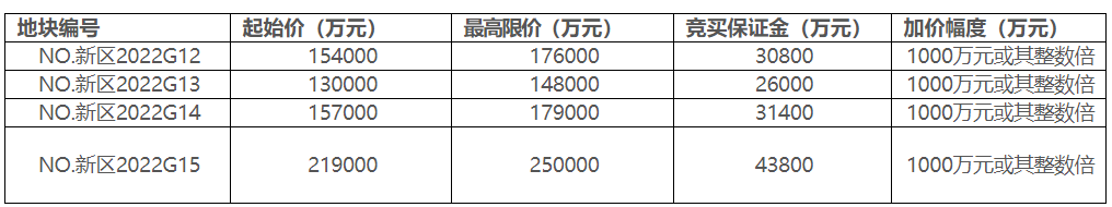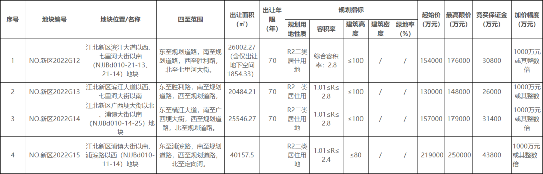 NO.新区2022G12地块为江北新区滨江大道以西、七里河大街以南(NJJBd010-21-13、21-14)地块。东至规划道路,南至规划道路,西至胜利路,北至七里河大街。规划用地性质为R2二类居住用地,出让面积26002.27㎡(含仅出让地下空间1854.33㎡),容积率1.01≤R≤2.8,建筑高度≤100米。挂牌起始价154000万元,最高限价176000万元。