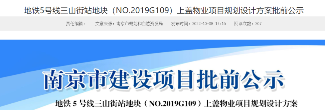 近日,据南京规划和自然资源局官网显示,地铁5号线三山街站地块(NO.2019G109)上盖物业项目设计方案公示。
