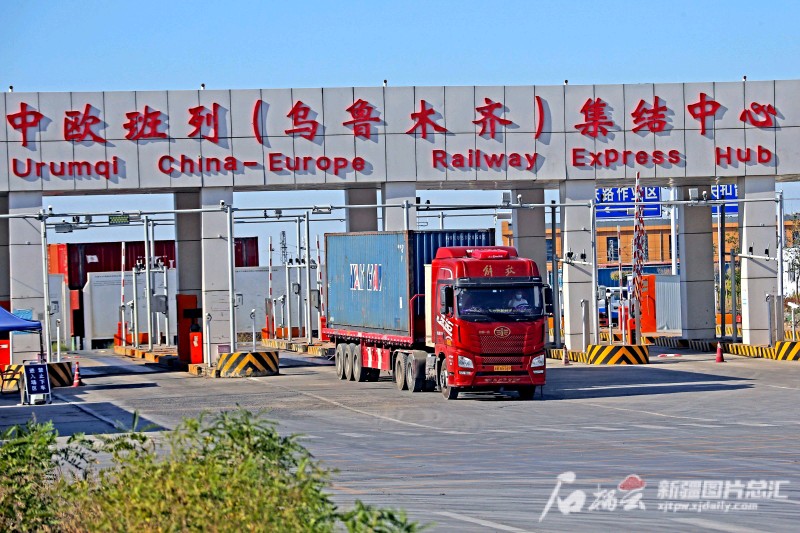 7月14日,一台卡车从乌鲁木齐国际陆港区中欧班列(乌鲁木齐)集结中心驶出(资料图片)。 石榴云/新疆日报记者 蔡增乐摄