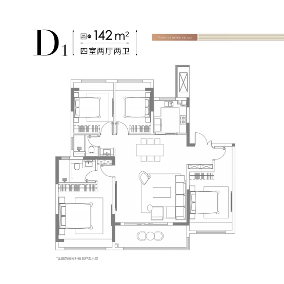 建面约142㎡户型,南北向卧室均带有观景大飘窗;主卧采用套房式设计,配备独立卫生间。