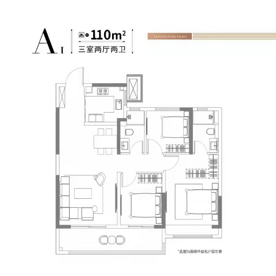 建面约110㎡户型,三开间朝南,南北通透保证了采光效果;客厅与次卧共享南向双阳台;主卧则通过套房设计保证了私密性。