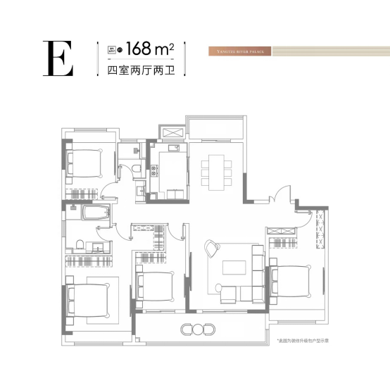 建面约168㎡户型,户型较为方正,四开间并排朝南,南北双阳台确保采光效果,客餐厅一体化设计;套房主卧,配备独立衣帽间,主卫配浴缸;整体空间感更好,功能性更强。