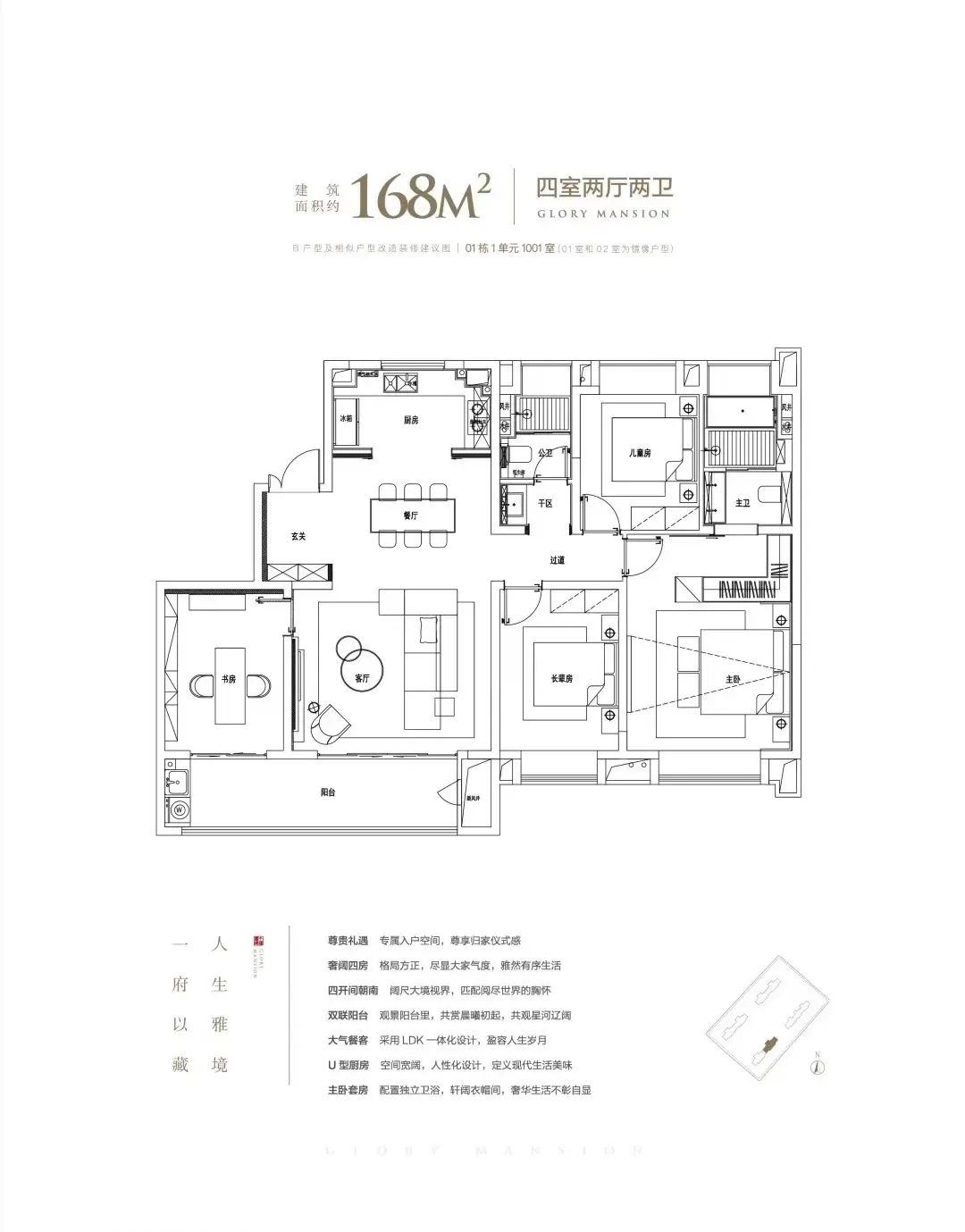 建面约168㎡户型:四房两厅两卫,是目前江核少有的160㎡以上的大户型。