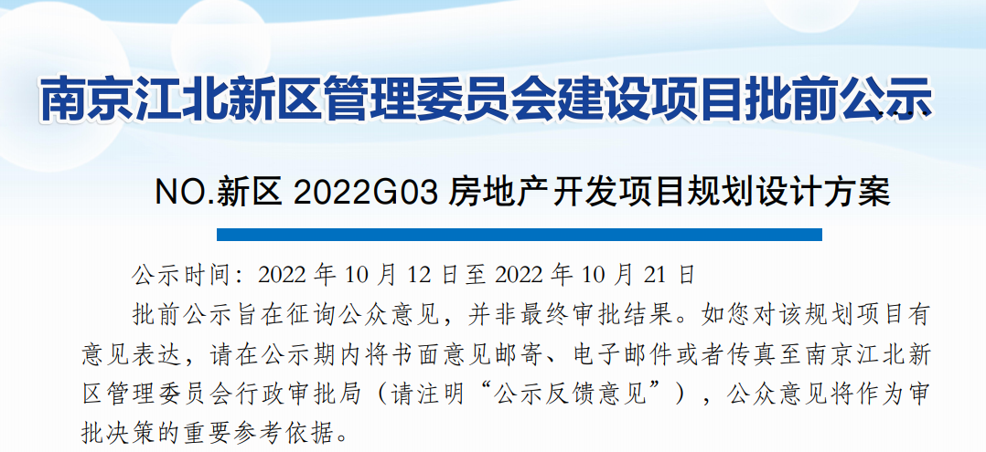 刚刚,江北新区官网发布了《NO.新区2022G03房地产开发项目规划设计方案批前公示》。