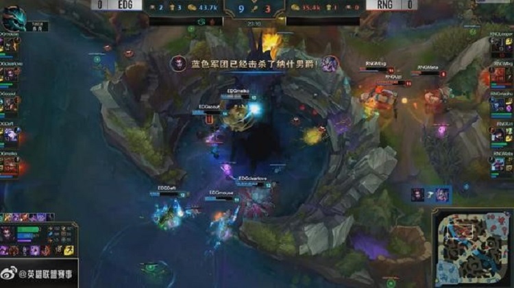 后期面对巨大的劣势,EDG对RNG的视野和经济都进行了的压制,差距越来越大。最终在第二条大龙重生后,EDG抓到野区的酒桶直接开团,打出一波1换4,推掉RNG基地。