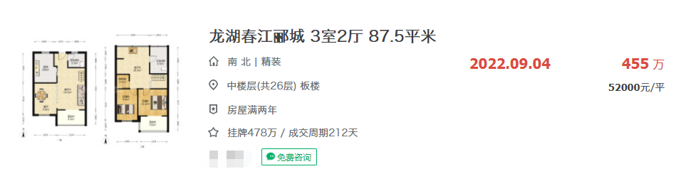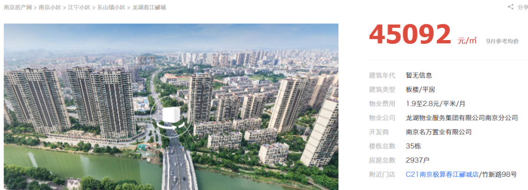 目前在链家网显示,小区今年9月的二手房挂牌均价45092元/㎡;最近一次成交为今年9月4日的一套87.5㎡小户型,单价52000元/㎡,总价455万。