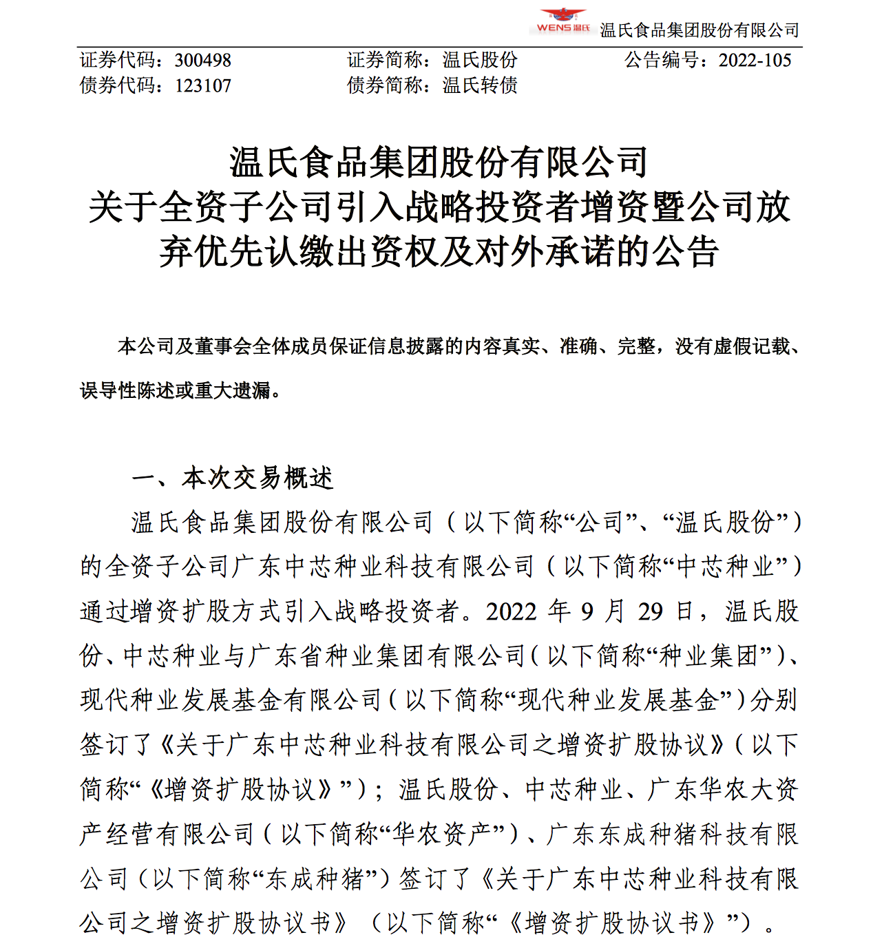 日前,温氏食品集团股份有限公司(以下简称“温氏股份”)发布公告称,其全资子公司——广东中芯种业科技有限公司(以下简称“中芯种业”)拟通过增资扩股方式引入引入国资战略投资,合计涉及投资额逾23亿元。