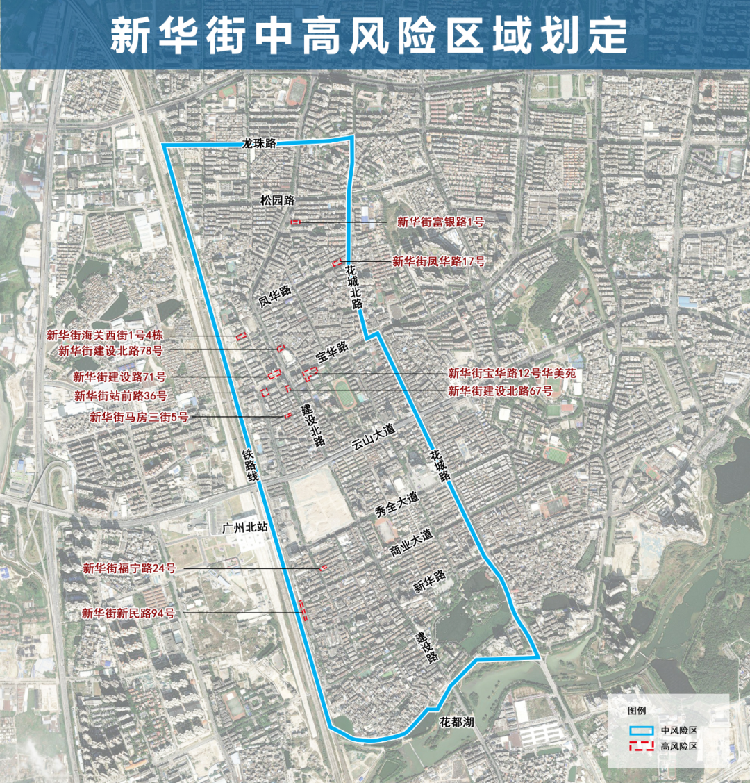 龙珠路以南、花都湖以北、铁路沿线以东、花城路及花城北路以西区域(高风险区除外),落实“人不出区、错峰取物”措施。