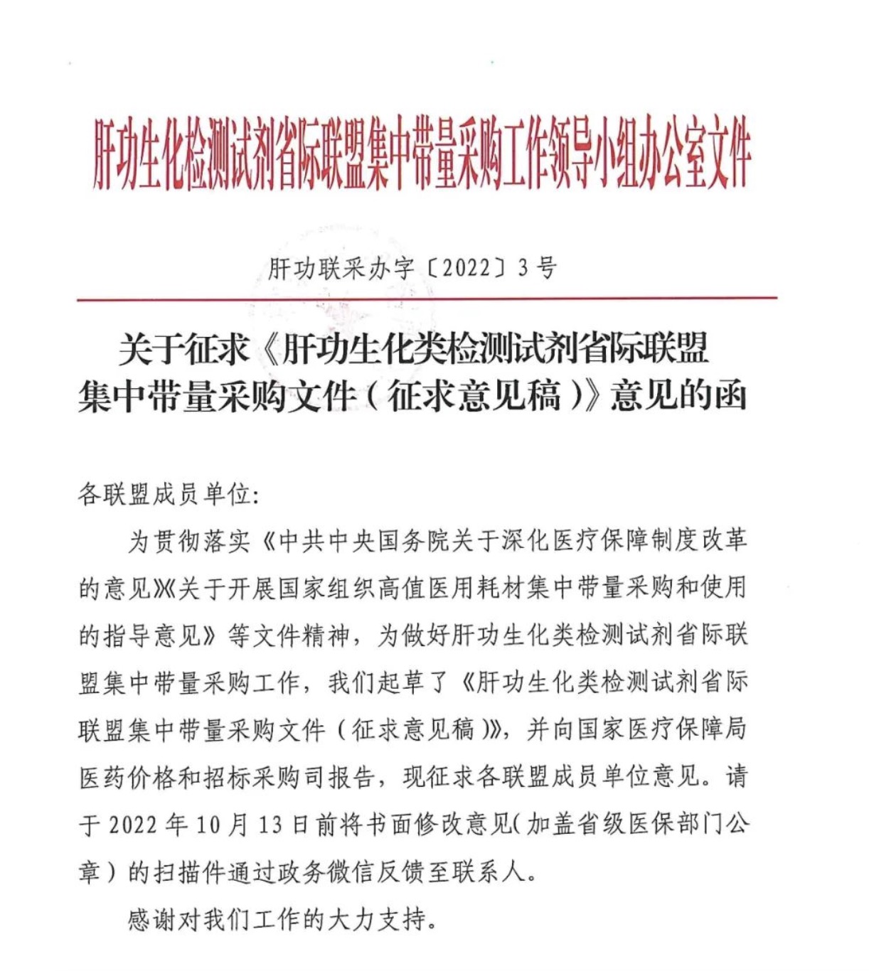 10月14日,业内流传由江西省牵头的22省区肝功能生化试剂集采方案征求意见稿(下简称:意见稿)文件。根据意见稿,此次肝功能生化试剂集采相对此前高值耗材集采更加温和,引发市场普遍关注。