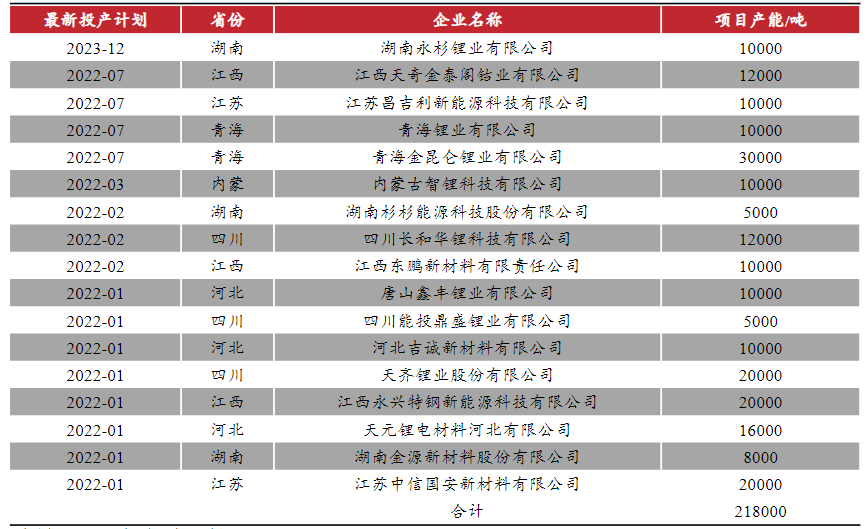 东亚前海证券统计显示,2022-2023年,将有天齐锂业(002466.SZ)、昆仑锂业等23家企业启动投产项目,新增碳酸锂产能合计达21.8万吨。根据该统计,最近的新增产能投产需等到2023年12月。