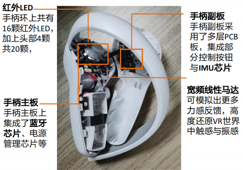 PICO4手柄主要升级在于结构、红外LED数量和全新的宽频线性马达:PICO4手柄采用全新的星环弧柱的设计更利于抓握,而手柄16颗手柄环上的红外LED与头部4颗LED形成的类拓扑结构保证了无死角追踪,有望提升手部操作识别的准确性。而手柄内置的马达直径20mm,振幅范围50Hz-500Hz,大小上已接近PS5手柄马达,相比Neo3和Quest 2的马达有显著提升。