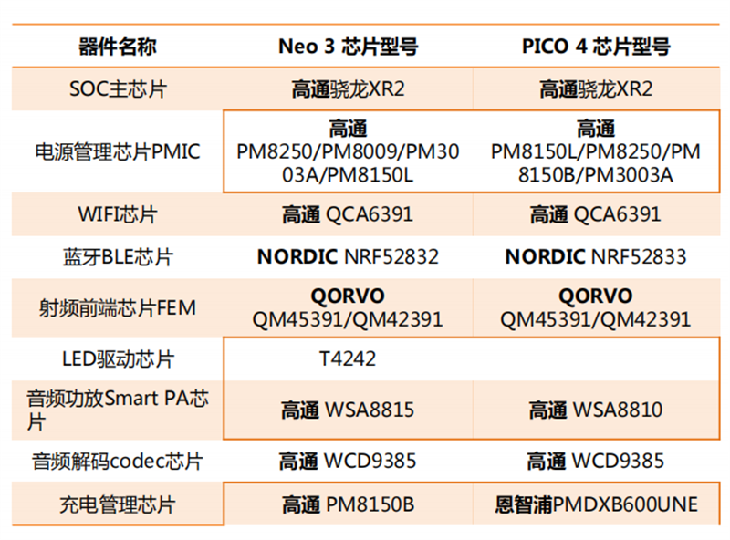 对比PICO 4 和NEO3 我们发现VR设备主板SOC 、WIFI 、蓝牙BLE 、射频前端、音频解码等芯片无明显变化。而电源管理、LED驱动、音频功放、充电管理、时钟发生器、电机驱动等芯片采用了全新芯片。