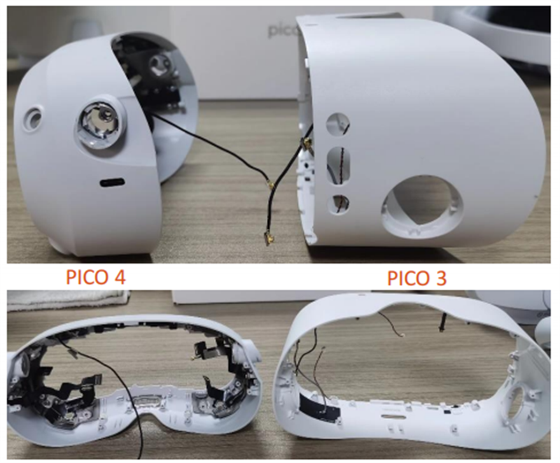 中框方面, 在采用Pancake方案后,能显著地做的更薄更小,同时内部结构也更紧凑。与此同时,内部的结构件+元器件也更紧凑。与Pico3一样,中框上核心的元器件为追踪定位摄像头*4,Wifi天线*2,蓝牙天线*2,麦克风模组*1。