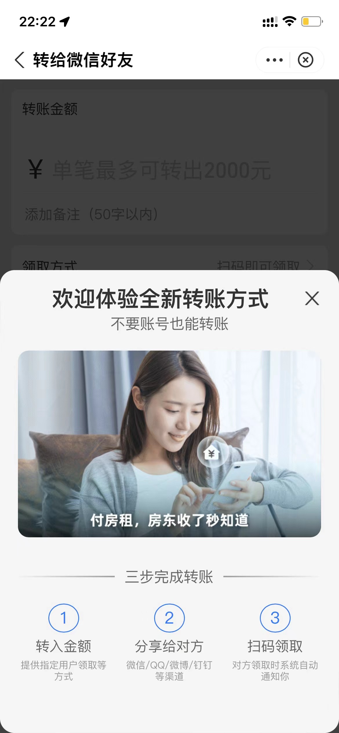 转账后,页面会自动生成一个二维码,收款人需要在24小时之内扫码领取资金,过期则原路返回。用户将二维码转发给微信、QQ好友后,好友扫码即可领取,单笔最多可转出2000元。