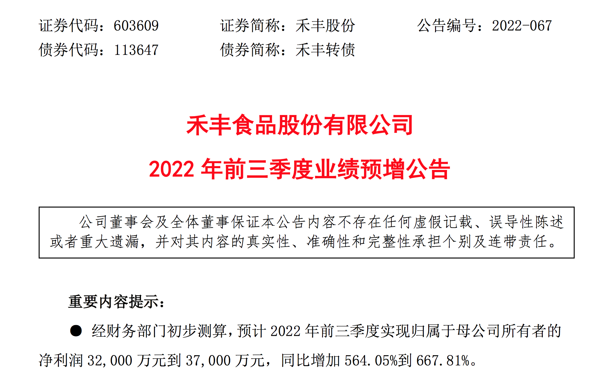 10月16日晚间,禾丰食品股份有限公司(以下简称“禾丰股份”)发布2022年前三季度业绩预增公告。经企业财务部门初步测算,预计2022年前三季度实现归属于母公司所有者的净利润3.2亿元到3.7亿元,同比增加564.05%到667.81%。