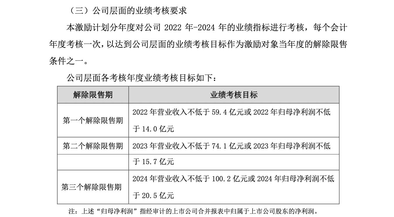 随着限制性股票激励计划涉及人员以及数量相继发布后,其考核目标也成为关注的焦点。根据股权激励规划显示,此次考核目标定位2022年至2024年营收目标不低于59.4亿元、74.1亿元和100.2亿元,或2022年至2024年归母净利目标不低于14亿元、15.7亿元和20.5亿元。