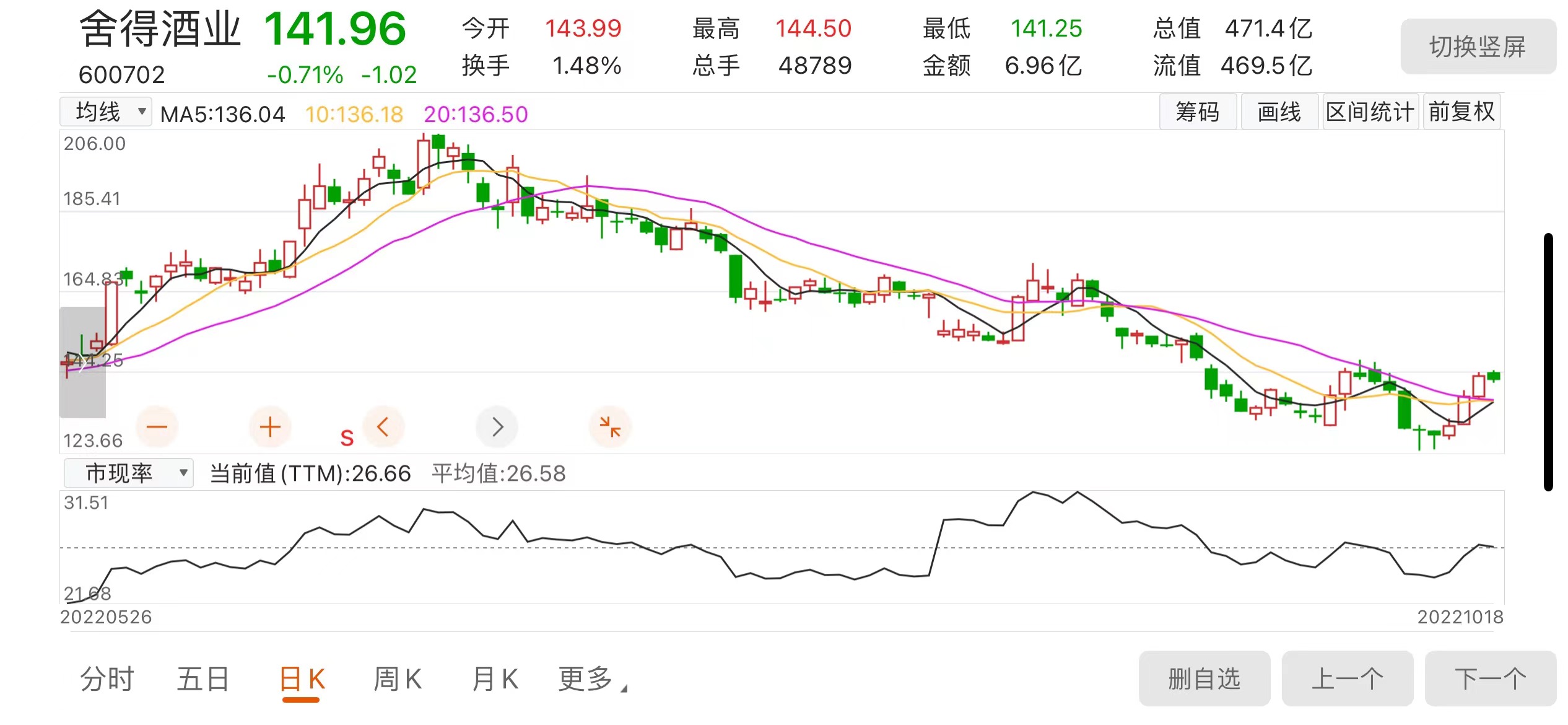 10月18日收盘,舍得酒业以141.96元/股价格收盘,涨幅-0.71%。据界面新闻统计,今日股价下跌终止了舍得酒业自10月13日至17日三个交易日连续上涨的态势。