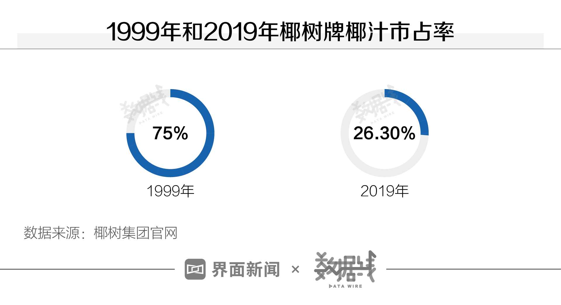 在上个世纪末椰树牌椰汁可谓“风光无限”,椰树集团此前在公告中提到,1994年椰树在全国饮料企业中销量排名第一。1999年,椰树椰汁市占率达到75%,而在2019年,其市占率下滑至26.3%,近20年下滑48.7%。