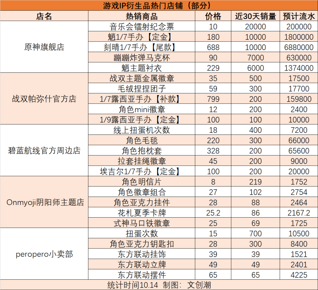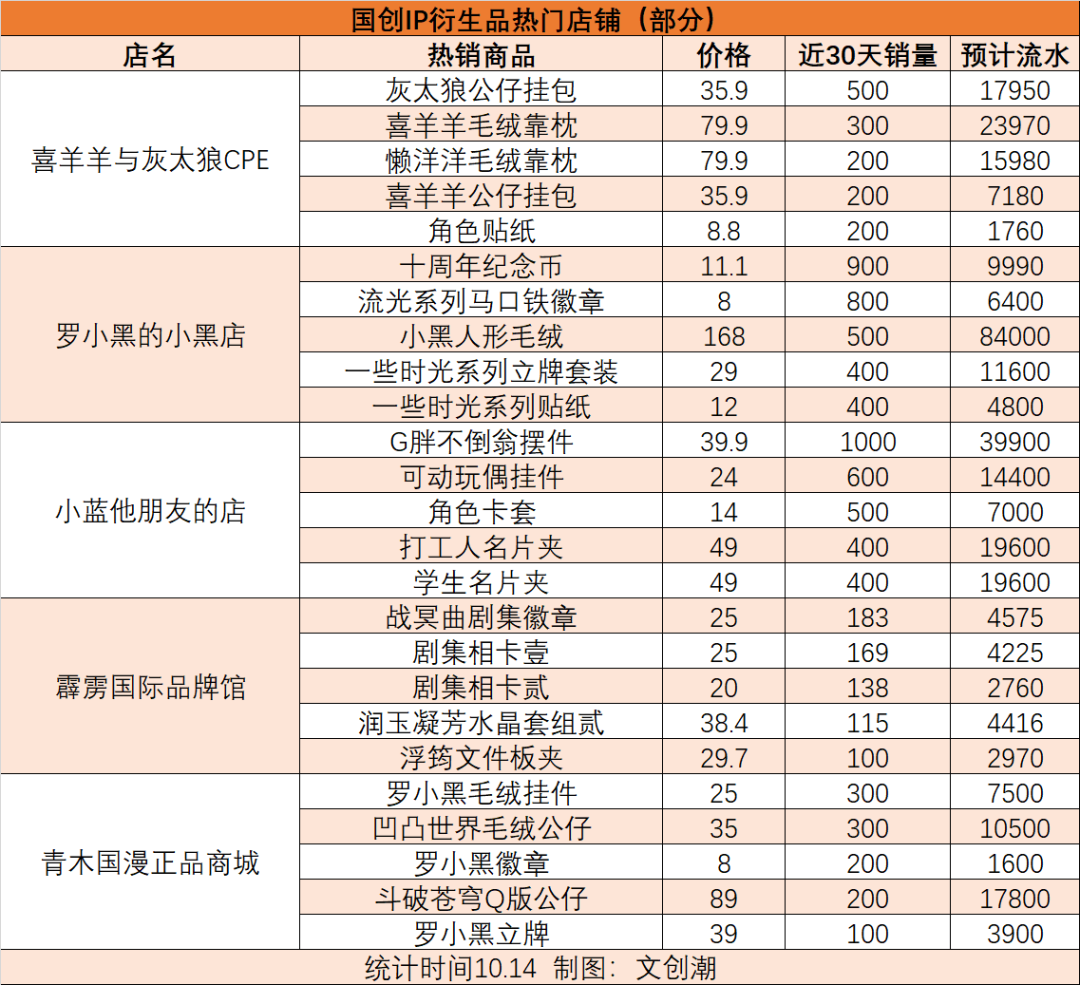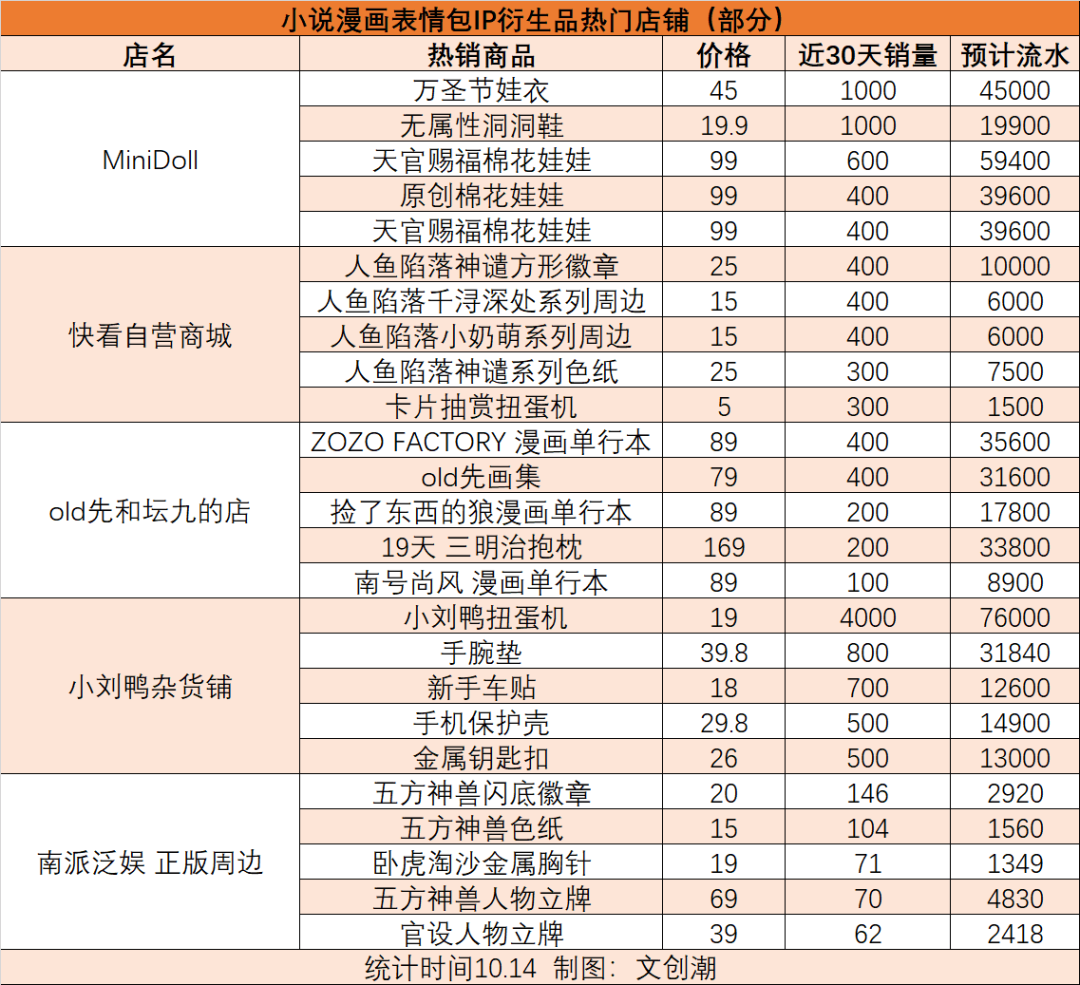 我们将IP分类为国创、游戏、小说漫画表情包这三类,在各种类中选取了5家热门店铺,分别统计店铺销量最高的5件商品。(为方便计算取整统计,例如"月销500+"取500进行计算。)