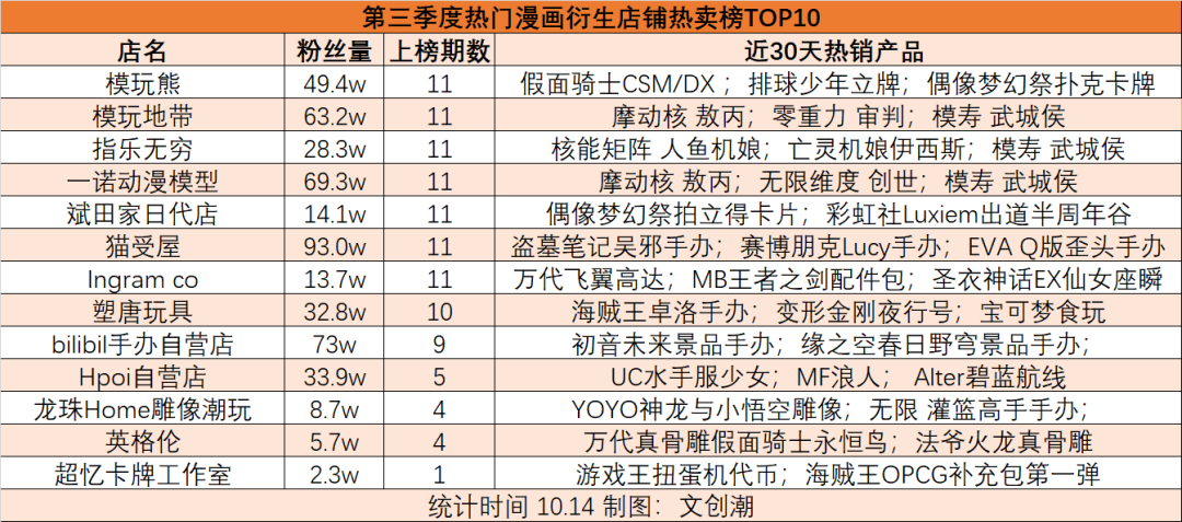 热门漫画衍生店铺的数据变动情况较少,三季度有13家店铺进入TOP10,分别是模玩熊、模玩地带、指乐无穷、一诺动漫模型、斌田家日代店、猫受屋、Ingram co、塑唐玩具、bilibil手办自营店、Hpoi自营店、龙珠Home雕像潮玩、英格伦、超忆卡牌工作室,其中前七家每期都上榜。