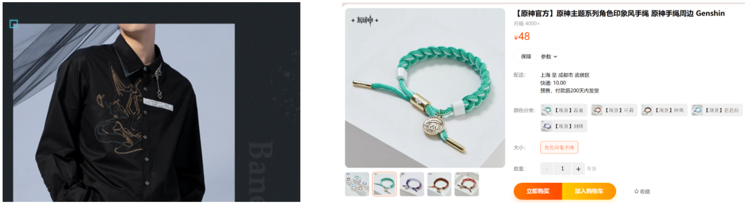 例如月销6000+的魈主题衬衣,风格设计上接近国风国潮元素。推出的印象风手绳,使用角色配色和Q版金属图案进行IP展示,收获月销4000+。