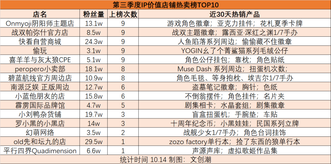 文创潮从IP价值店铺热卖榜、国创衍生品店铺热卖榜、热门漫画衍生店铺榜这三个榜单来回顾,统计三季度中曾进入各榜单TOP10的店铺,以及店内正在热销的商品。