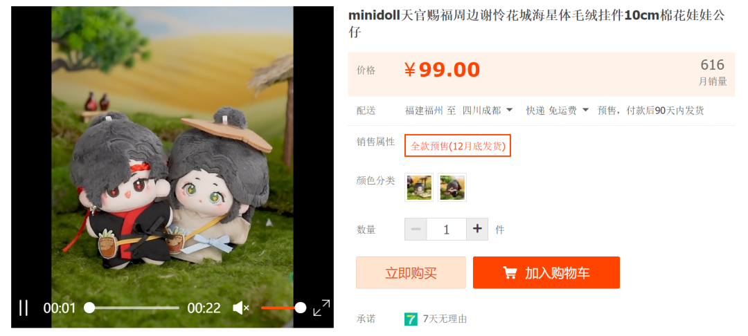 从商品类型来看,符合时令节日的万圣节娃衣月销超过1000件,有属性的《天官赐福》谢怜、花城棉花娃娃月销超600件。