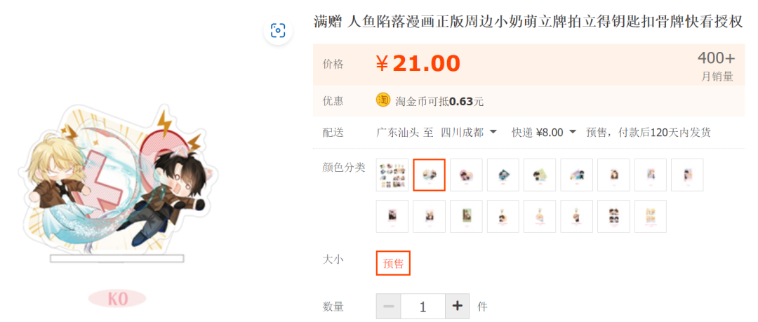 以快看自营商城中的《人鱼陷落》系列周边为例,周边包含迷你立牌、拍立得、钥匙扣、人物骨牌等选项,单品价格在15-36元不等。