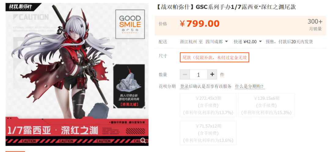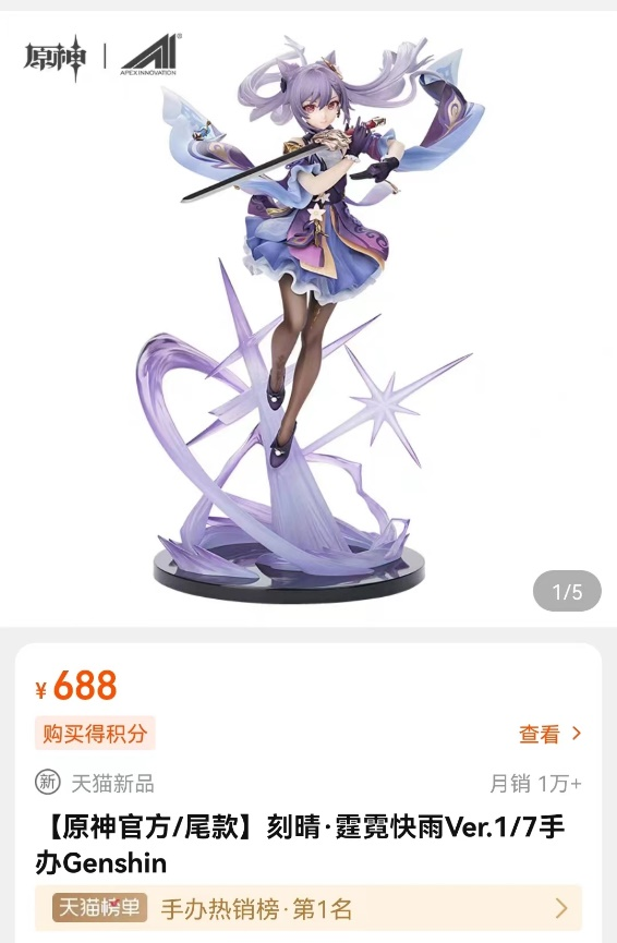 流水数据方面,《原神》刻晴1/7手办正在补尾款阶段,根据淘宝显示其月销上万,这意味着仅这一个单品的月流水就超过688万。