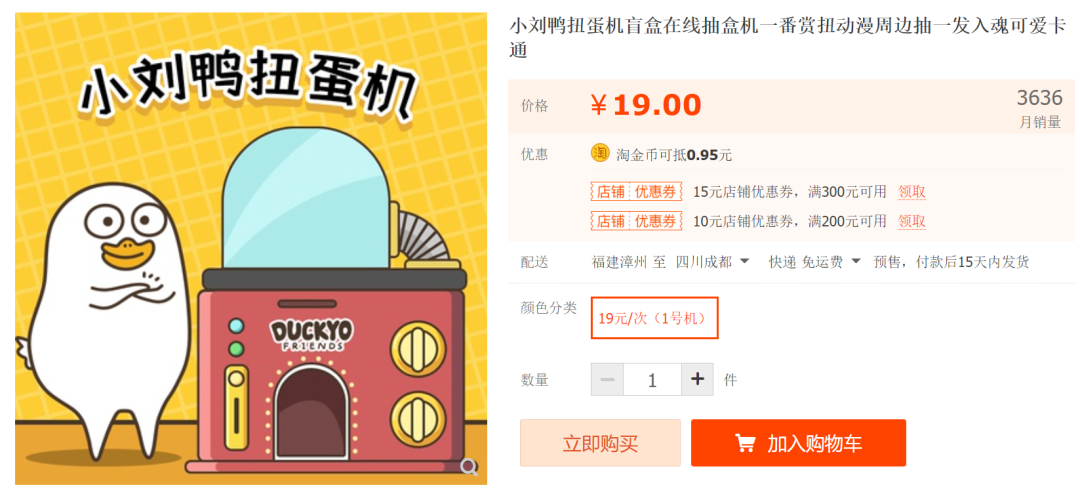 以小刘鸭杂货铺和小蓝他朋友的店为例,小刘鸭销售的扭蛋机月销数据超过3000,小蓝不倒翁桌面摆件的月销也有1000多件。