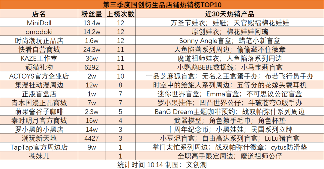 接下来是国创衍生品店铺热卖榜,三季度内有16家店铺曾进入TOP10,分别是MiniDoll、omodoki、时尚潮玩正品店、快看自营商城、KAZE工作室、顽猫礼物、ACTOYS官方企业店、集漫社动漫周边、正版盲盒店、青木国漫正品商城、萌果酱谷子咖啡、秦时明月官方商城、罗小黑的小黑店、潮玩新天地、TapTap官方周边店、苍妹儿。