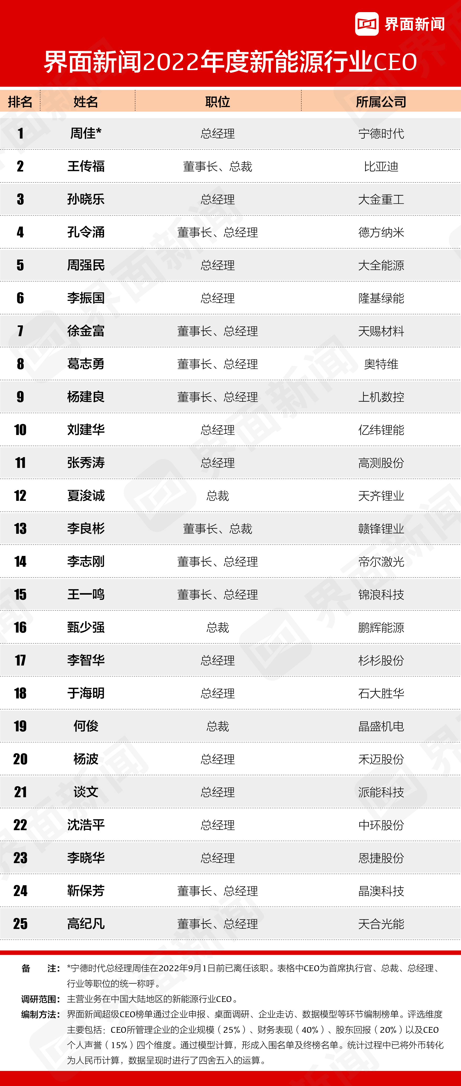 本篇中CEO为首席执行官、总裁、总经理、行长等职位的统一称呼。我们的研究面向中国地区新能源企业CEO,通过企业申报、桌面调研、企业走访、数据模型等环节编制榜单。评选维度主要包括:企业规模(25%)、财务表现(40%)、股东回报(20%)、个人声誉(15%)四个维度。通过模型估算,形成入围名单及终榜名单。统计过程中已将外币转化为人民币计算,数据呈现时进行了四舍五入的运算。