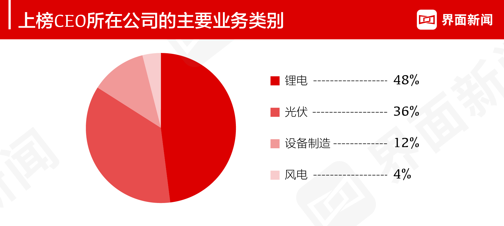 从上榜CEO所在公司的主营业务来看,以锂电池材料为主的公司占比最多,有12家;主营光伏相关业务的公司有9家。