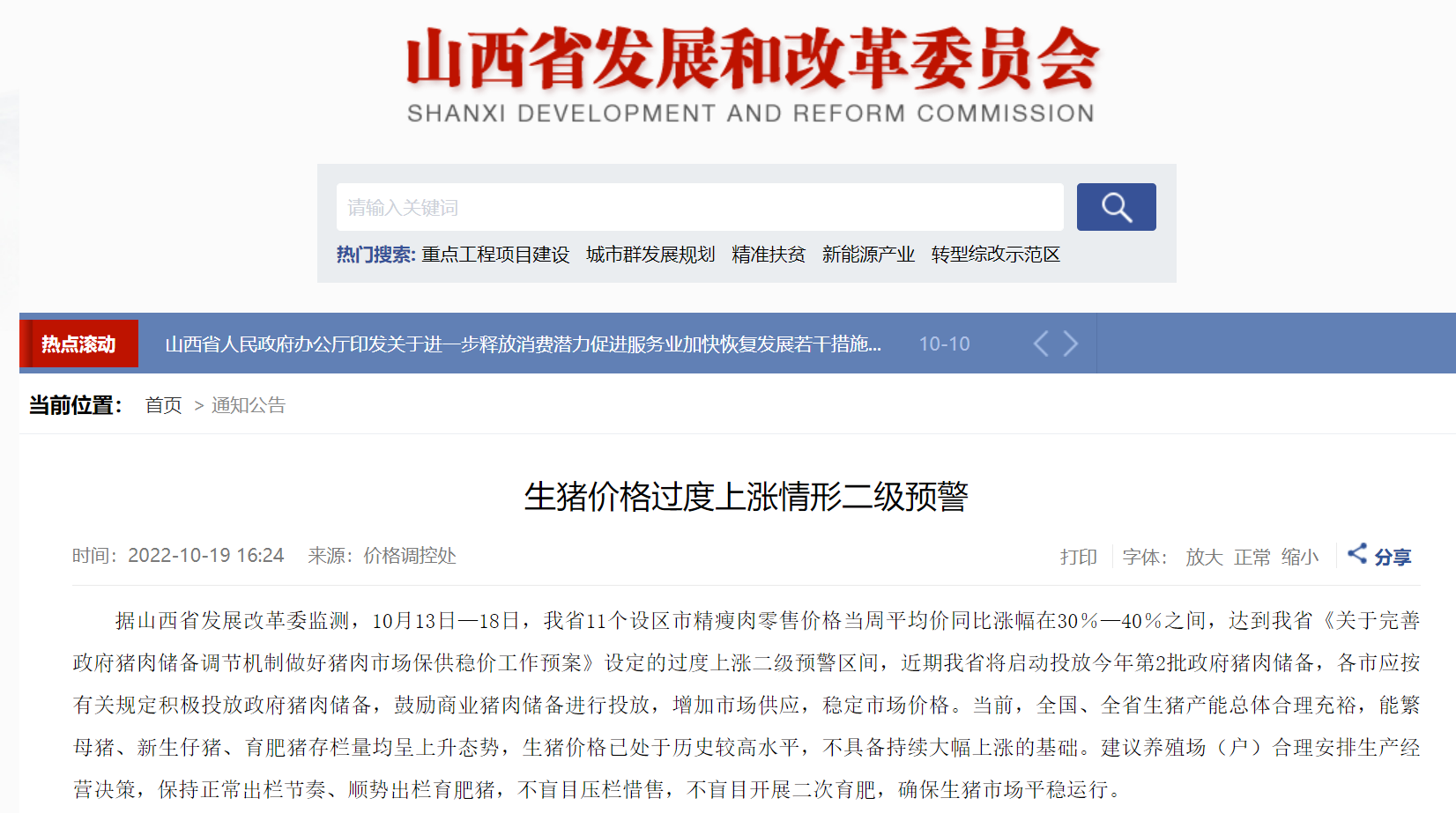山西发改委网站10月19日消息,据山西省发展改革委监测,10月13日-18日,山西省11个设区市精瘦肉零售价格当周平均价同比涨幅在30%-40%之间,达到山西省《关于完善政府猪肉储备调节机制做好猪肉市场保供稳价工作预案》设定的过度上涨二级预警区间,近期山西省将启动投放今年第2批政府猪肉储备,各市应按有关规定积极投放政府猪肉储备,鼓励商业猪肉储备进行投放,增加市场供应,稳定市场价格。当前,全国、全省生猪产能总体合理充裕,能繁母猪、新生仔猪、育肥猪存栏量均呈上升态势,生猪价格已处于历史较高水平,不具备持续大幅上涨的基础。建议养殖场(户)合理安排生产经营决策,保持正常出栏节奏、顺势出栏育肥猪,不盲目压栏惜售,不盲目开展二次育肥,确保生猪市场平稳运行。