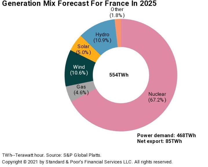 目前法国有35%的家庭取暖使用电力,而在主要使用天然气取暖的德国,电暖比例仅为5%。对于法国而言,冬季平均气温下降1度即相当于额外产生2.5座核电站装机容量的用电需求。