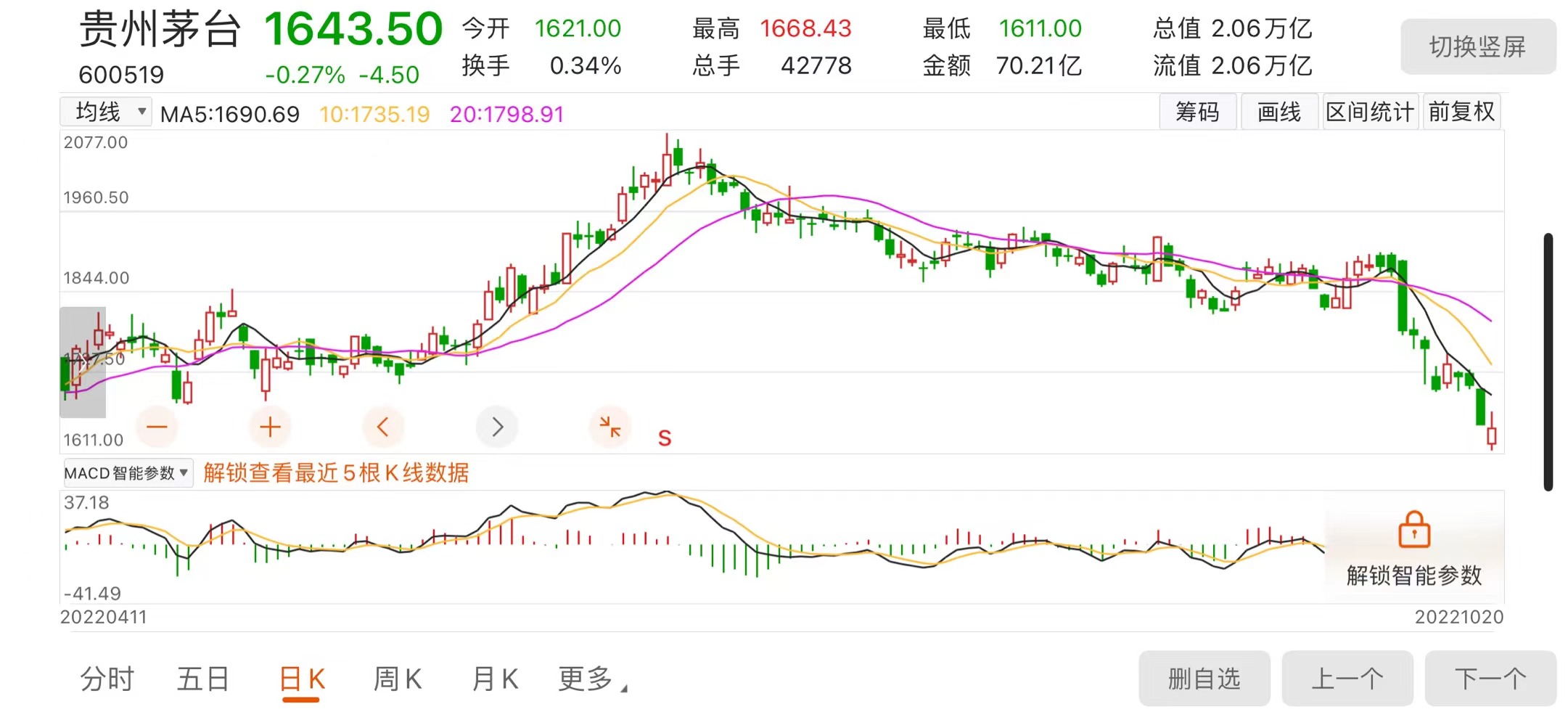 10月20日,贵州茅台以1643.5元/股收盘,涨幅为-0.27%。在10月以来的9个交易日里,贵州茅台有7个交易日均以下跌收盘,股价从1891元跌至1643.5元,跌幅13.09%,市值蒸发超3000亿。