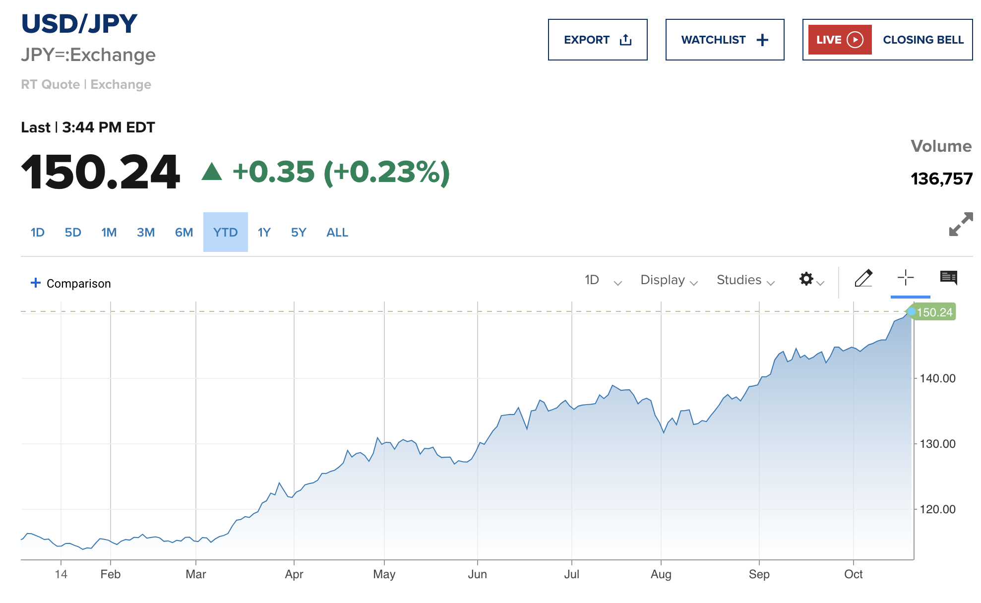 随着美联储持续激进加息,日元对美元汇率周四跌破150日元关键点位,创下1990年8月以来最低水平。