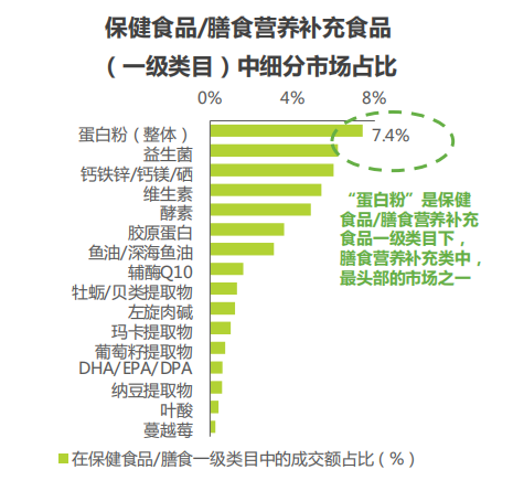 根据头豹研究院的数据显示,2019年中国蛋白粉行业市场规模已达到14.6亿元人民币,年复合增长率为9.5%,预计2023年市场规模将达到18.5亿元。艾瑞咨询发布的《2022年蛋白粉:乳清蛋白消费趋势报告》中显示,今年7月蛋白粉在保健食品/膳食营养补充食品一级类目中成交额占据7.4%,是该类目下第一大成交的细分市场。