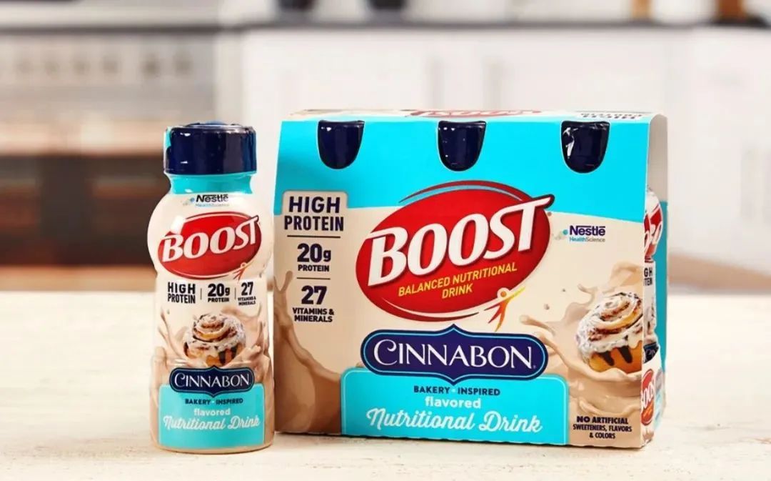 今年5月份,雀巢Cinnabon合作推出的一款名为Boost Cinnabon的肉桂风味运动能量蛋白饮料。产品富含蛋白质、维生素和矿物质等营养成分,每8盎司即可以提供约20克蛋白以及适当能量和营养物质,可同时支持人体肌肉、免疫和骨骼健康。