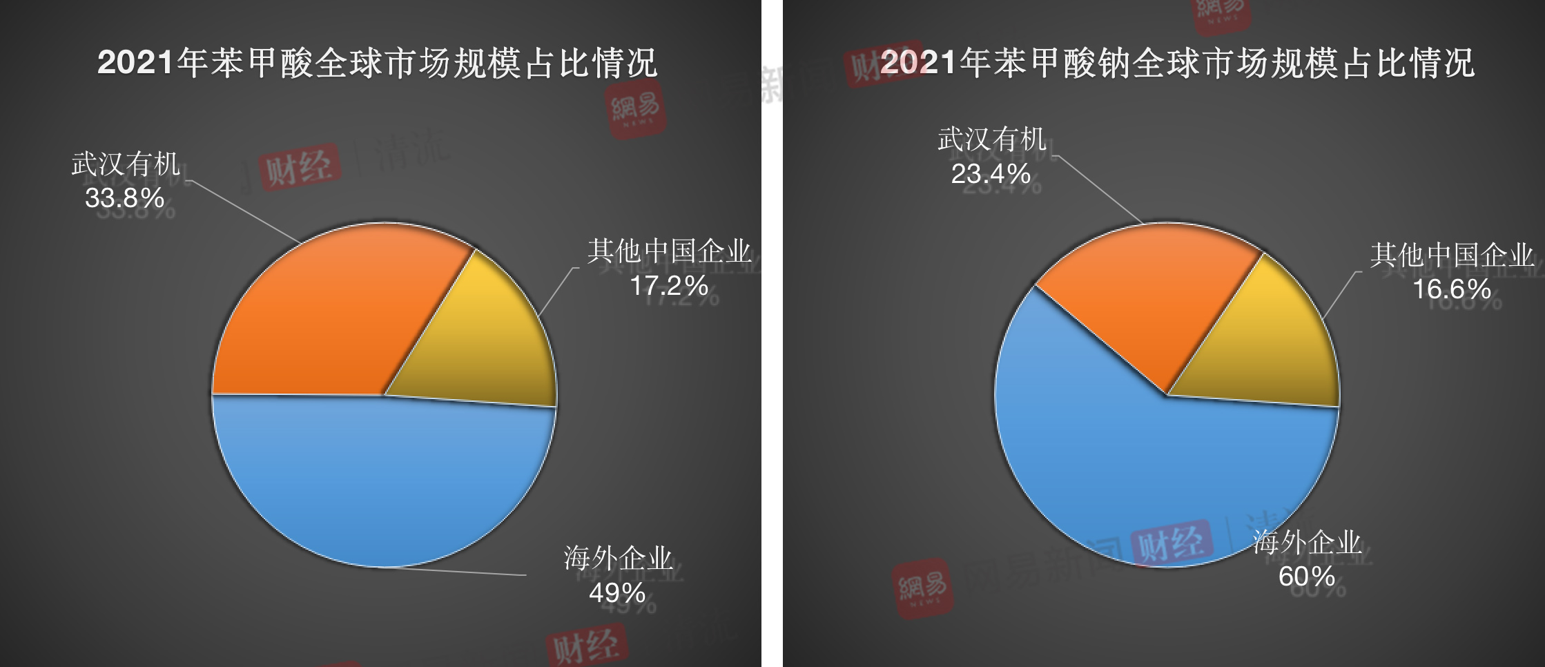 根据武汉有机委托沙利文编撰的行业报告,2021年,全球苯甲酸的销售收入约为22.2亿元。按市场收入计,三家中国的苯甲酸制造商销售苯甲酸的收入合计为11.43亿元,占全球总市场规模的51%。2021年,全球苯甲酸钠的销售收入约为19.3亿元,三家中国的苯甲酸钠制造商销售苯甲酸钠的收入总额为7.64亿元,占比也达40%。