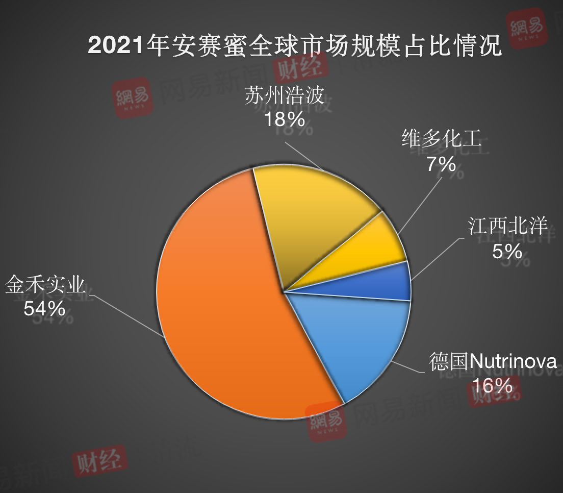 随着低糖食品的风靡,安赛蜜这种只增加甜味不增加热量的添加剂频繁出现在无糖、低糖饮料的配料表中。金禾实业(002597.SZ)是全球高端甜味剂的领先企业,其安赛蜜、三氯蔗糖和麦芽酚等产品的产能和市场占有率在全球范围内均处于领先地位。据华经产业研究院的报告,安赛蜜有效产能占全球总产能的54%。