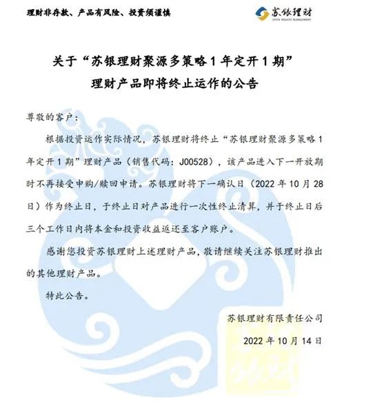 苏银理财官网信息公告显示,旗下理财产品“聚源多策略1年定开1期”将于2022年10月28日提前终止运作。