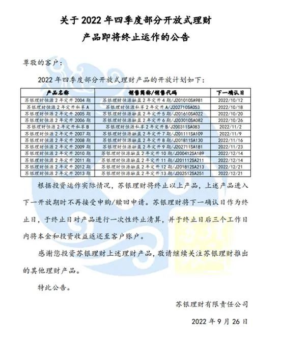 根据信披资料不完全统计,2022下半年苏银理财已经有超过10只产品提前终止。