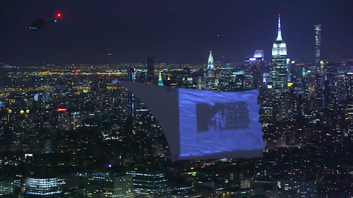 仔细看的话,不难发现幕布上2016MTV音乐录影带大奖(2016 MTV Video Music Awards)的logo,这个250英尺的巨幅空中投影屏幕正以闪烁的不同画面宣传着MTV音乐盛典,而旁边竟还有两架直升飞机在“护驾”。