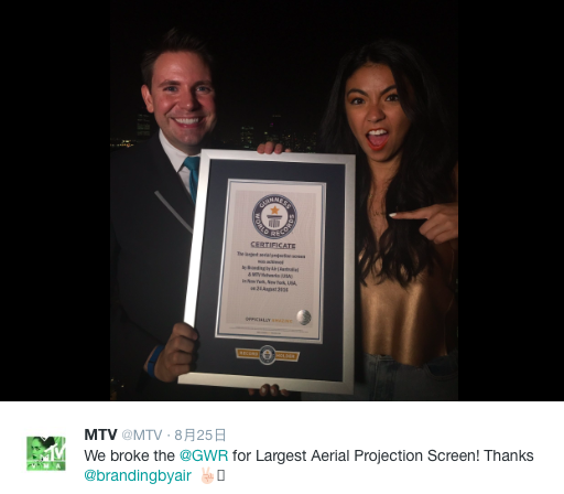 以这样的方式为音乐盛典宣传预热,对MTV全球音乐电视网来说也是第一次。而这场形式独特的空中广告还获得了吉尼斯世界纪录委员会的认证。