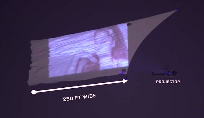 这场吸引眼球的“表演”是由专门做“空中/航空营销”(aerial marketing)的Branding By Air公司完成。他们用一架直升机拖拽着巨幅幕布,另一架直升机上有人负责将视频投射到幕布上。