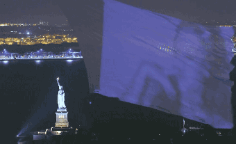 上周三如果你在纽约,还碰巧在晚上出去晃荡,也许会撞见这样的壮观场面:哈德逊河上空飘着个“幽灵”一样的巨大投影幕布,一会出现莉安娜·格兰德的脸,一会出现电视广告画面。