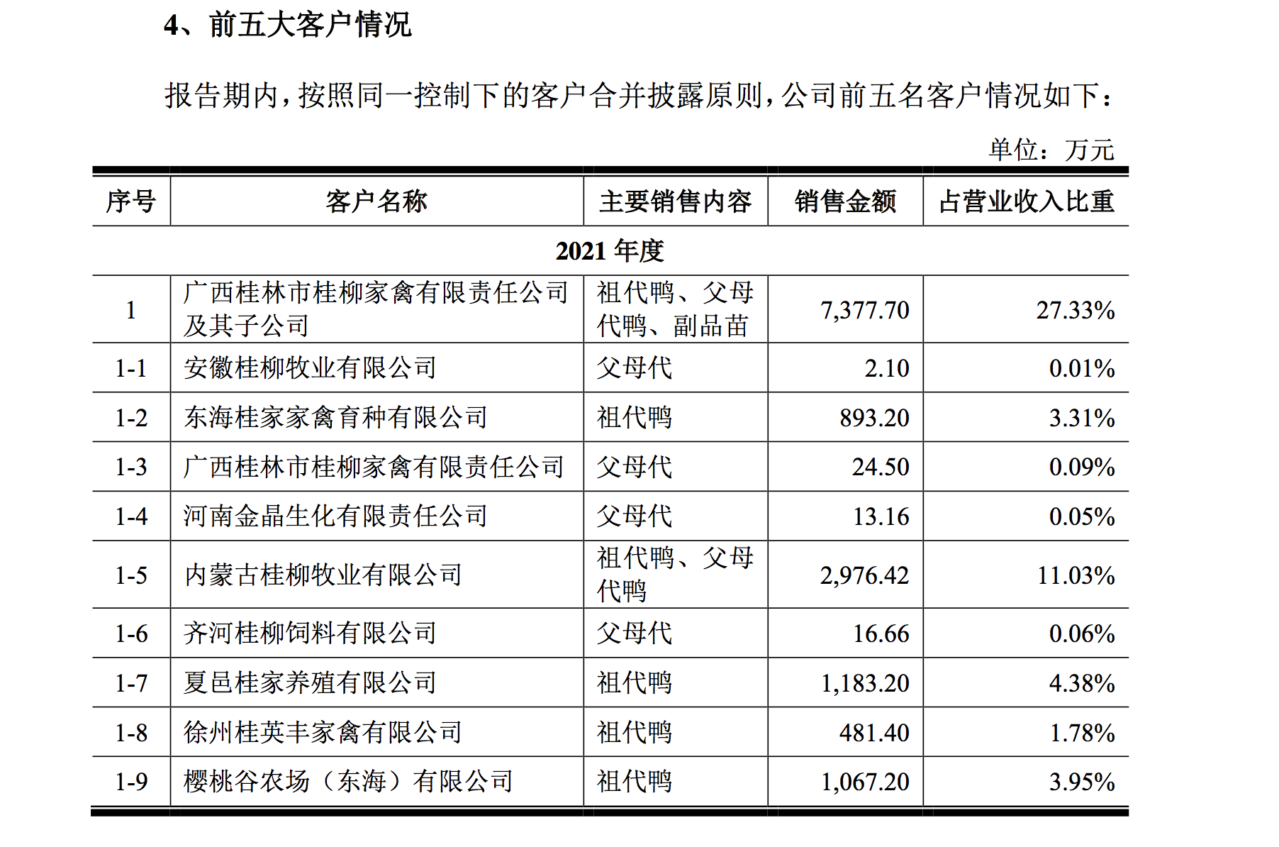 其次,招股书显示,2020年、2021年桂柳系客户占营业收入的比例较大,公司对于桂柳系客户存在重大依赖。桂柳系客户是指桂柳集团及其下属子公司,包括桂林市桂柳家禽有限责任公司、安徽桂柳牧业有限公司在内的等十一家企业。2019 年、2020 年和 2021 年,公司对桂柳系客户销售收入占比分别为 13.92%、23.13%、27.33%,对桂柳系客户销售毛利占比分别为 21.76%、50.86%和58.23%。由于 2020 年、2021 年毛利占比超过 50%,发行人对桂柳系客户构成重大依赖。