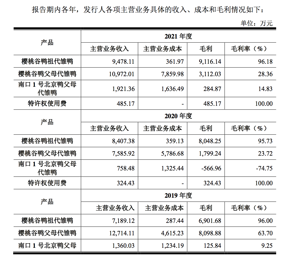 掌握着樱桃谷鸭育种核心技术的樱桃谷公司凭祖代雏鸭获得高利润率,但界面新闻记者翻阅招股书后也注意到樱桃谷近三年的营业收入、净利润存在波动现象。2019年、2020年、2021年,企业归母净利润分别为1.16亿元、4875.58亿元、8074.31亿元。