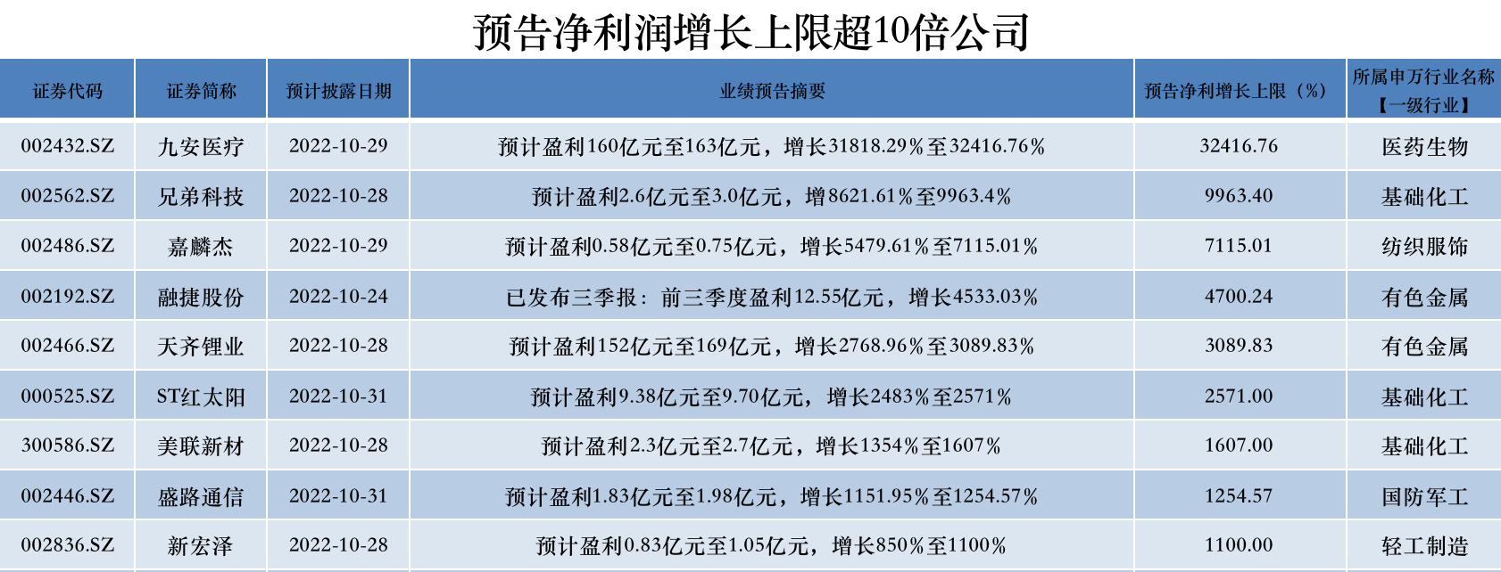 9家公司三季报净利增幅超10倍,九安医疗预增超30倍
